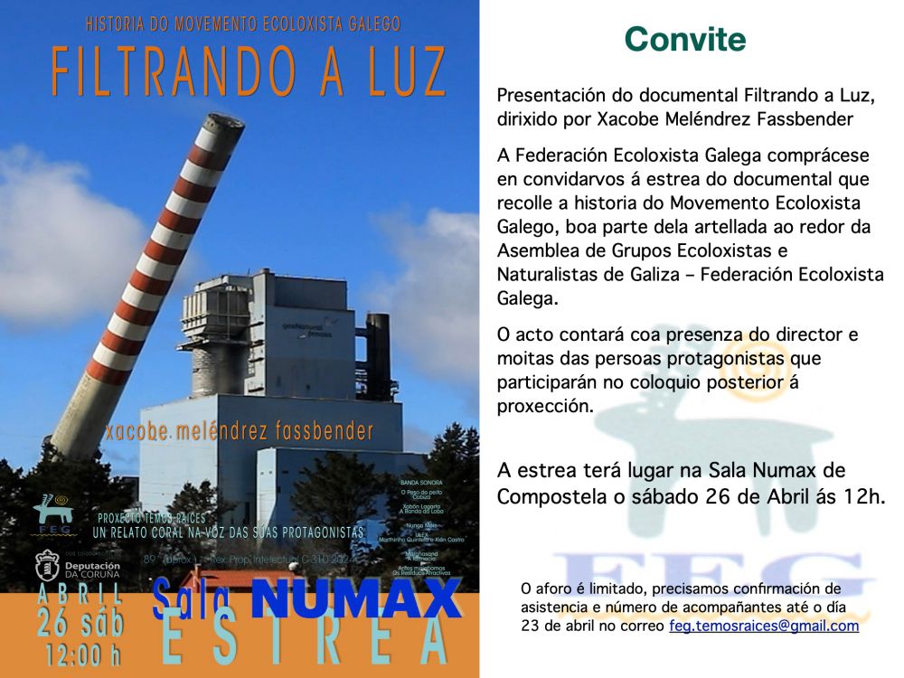 👉Será ás 20h na Sala García de Vilagarcia de Arousa, organizado polo Colectivo Ecoloxista do Salnés coa presenza do director Xacobe Meléndrez e algúns protagonistas.