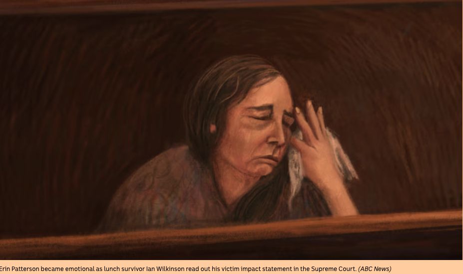 Thoroughly obsessed with the court sketch art from the mushroom lunch trial, the latest has gone full Munch