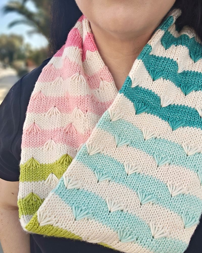 Pre-joining and pre-blocking pic of the Mount Floral Cowl, pattern coming March 27!