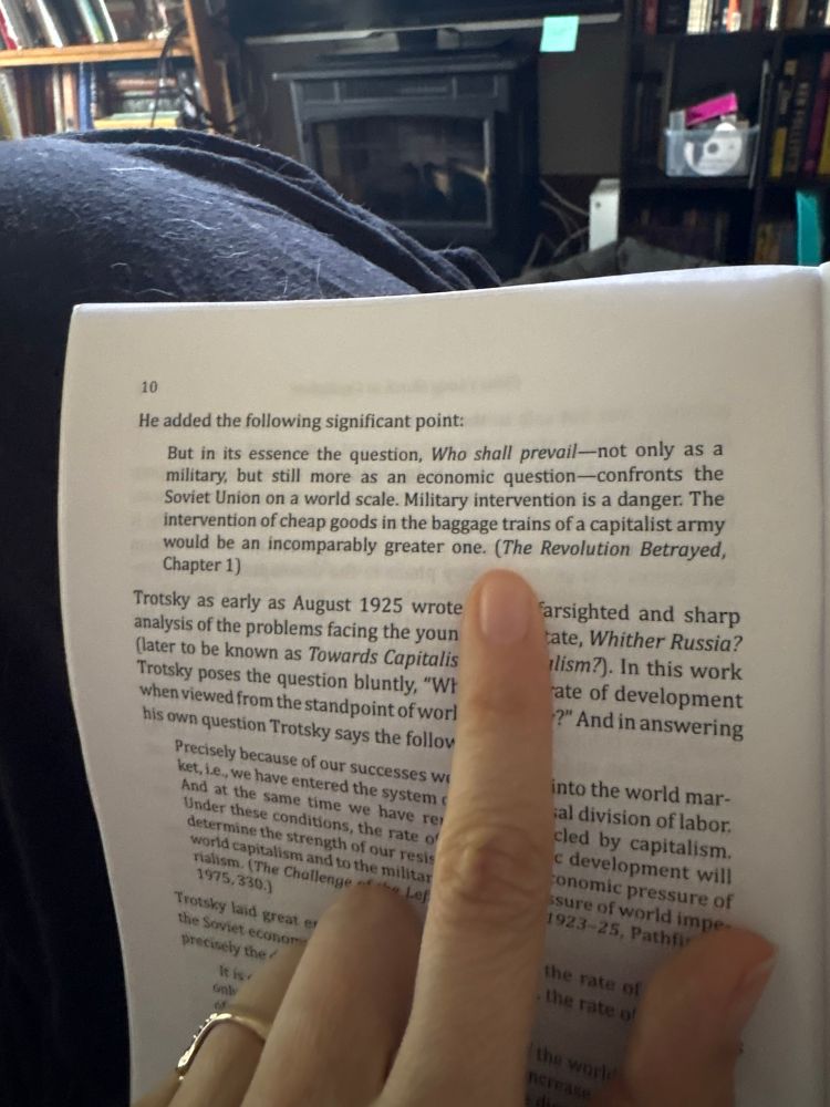 Wut I can’t add alt text after posting. Photograph of a finger pointing at a line of text, says “Military intervention is a danger. The intervention of cheap goods in the baggage trains of a capitalist army would be an incomparably greater one. (The Revolution Betrayed, Ch. 1)”