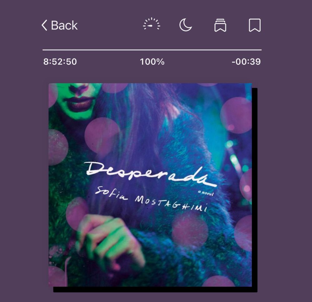 Finished #DESPERADA by Sofia Mostaghimi. Reminded me of MY YEAR OF REST AND RELAXATION but add in grief, travel, sex addiction (v. hetero). Annoying but funny narrator. Some v. fresh images. I liked it. Will *never* recommend to my mother. Beautifully narrated! #books