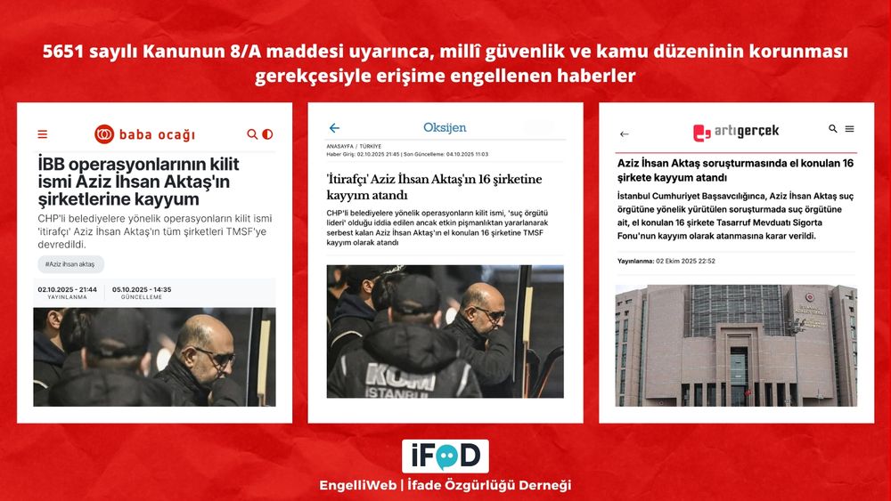 CHP'li belediyelere yönelik soruşturma kapsamında iş insanı Aziz İhsan Aktaş'a ait şirketlere kayyum atanmasına ilişkin haberler, 5651 sayılı Kanunun 8/A maddesi uyarınca, millî güvenlik ve kamu düzeninin korunması gerekçesiyle erişime engellendi. ifade.org.tr/engelliweb/a...