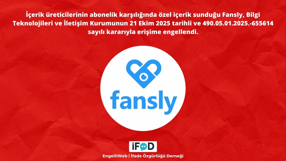 İçerik üreticilerinin abonelik karşılığında özel içerik sunduğu Fansly, Bilgi Teknolojileri ve İletişim Kurumunun 21 Ekim 2025 tarihli ve 490.05.01.2025.-655614 sayılı kararıyla erişime engellendi. ifade.org.tr/engelliweb/f...