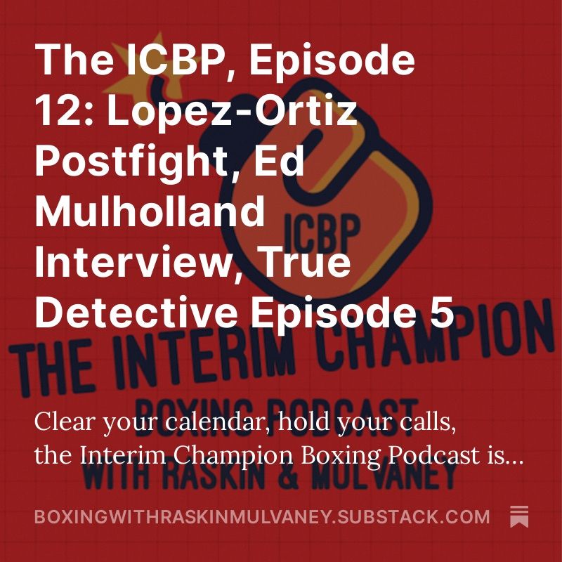 Super-sized Saturday episode of the ICBP! BWAA Courage Award winner Ed Mulholland joins the pod to talk boxers, snapping pics, and beating throat cancer, plus Kieran andI c over #LopezOrtiz, Keyshawn, #HaneyGarcia, True Detective Ep 5, and more: tinyurl.com/mr235p27