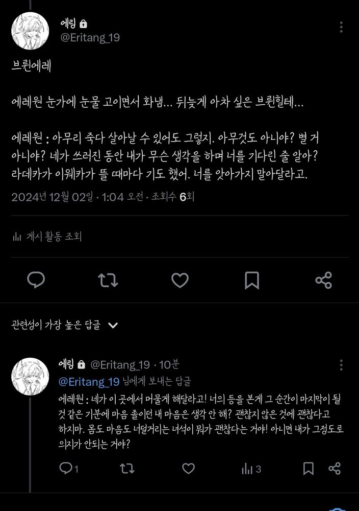 멩멀... 그냥 아무것도 바라지 않는 인외메이 같은 느낌이라 질리면 떠날 것 같은 불안함 = 멀린의 불안함 < 이게 타로에서 나왔을 때 너무 짜릿했음