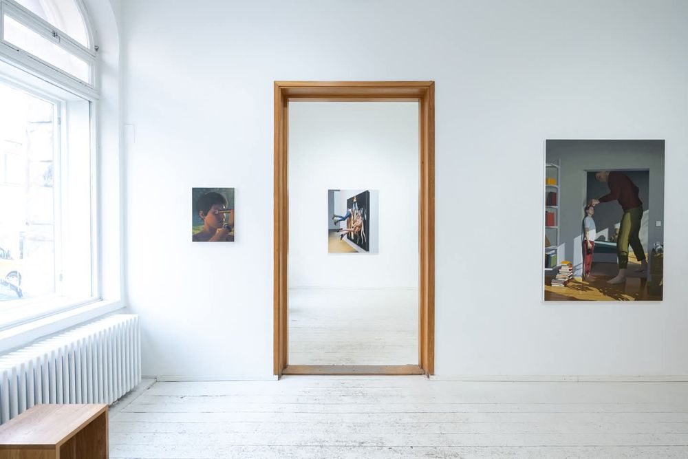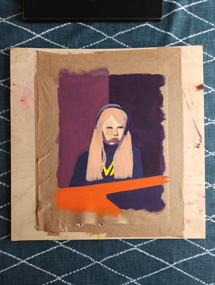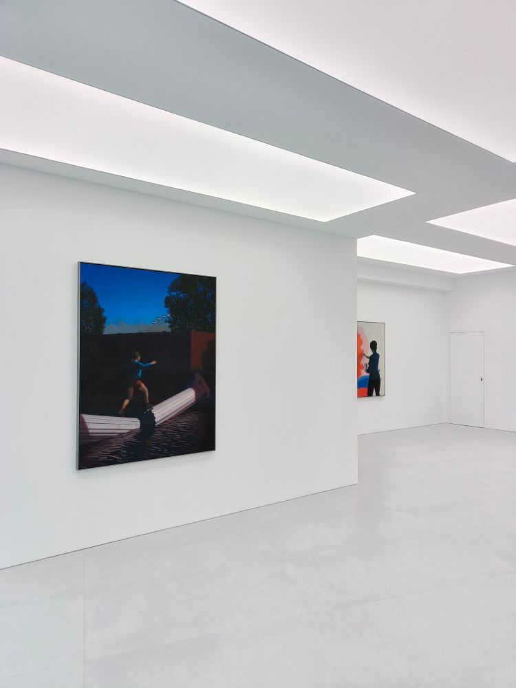 Crossing is the newest work in the show, painted in May. I particularly like how the environment looks artificial and arranged, like a film set. I am planning to use the same character in other paintings