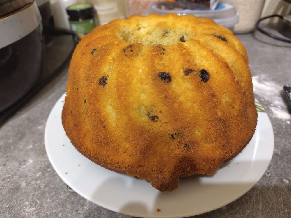 Mein erster Gugelhupf, Zitronenkuchen, mit Apfelstückchen, Rosinen und Zitronenguss. Selbstgebacken, keine fertig Mischung :D Sehr gelungen. Ich mags. Hier das Rezept, die Idee mit den Apfelstückchen und rosinen ist von mir www.einfachbacken.de/rezepte/zitr...