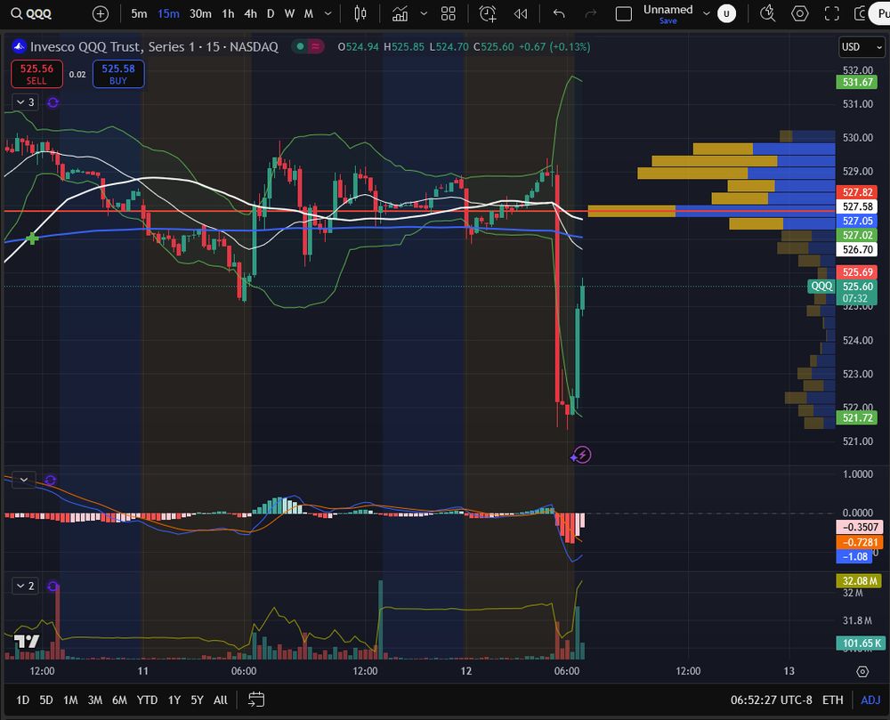 #QQQ Daily Chart: Chart hints at exhausted sellers, & MACD could turn up from here. A pop to 531 won't be enough for a months-long bullish outlook. A march toward new ATHs will be needed. The 15 minute chart, however, is set up for an early move north after a shallow MACD reset & a B Band pinch.