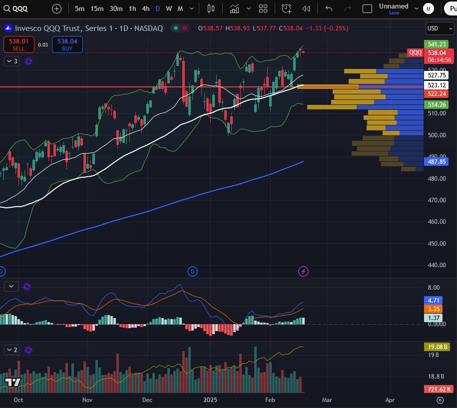 #QQQ Daily Chart: PPS now sitting at Upper Band after a sharp move north off the SMA. MACD looks ready to roll over & fade. Accum flattened & is sideways ATM. What could play out from here is a fade to a rising SMA with a support test of 530ish, which is also a shelf on the Volume Profile.