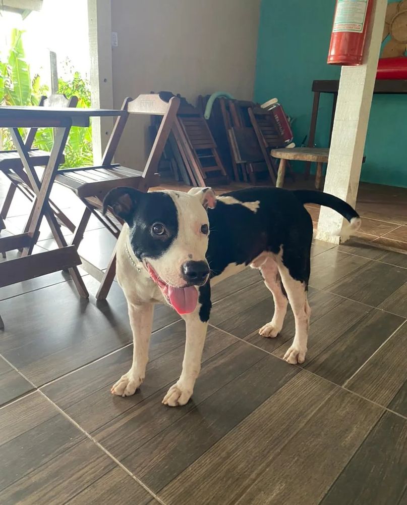 Zeus tem cerca de 1 ano e meio e está sofrendo maus-tratos. Fica preso o dia todo numa corda, dorme no cimento puro, apanha muito do dono. Passa fome. É muito dócil.