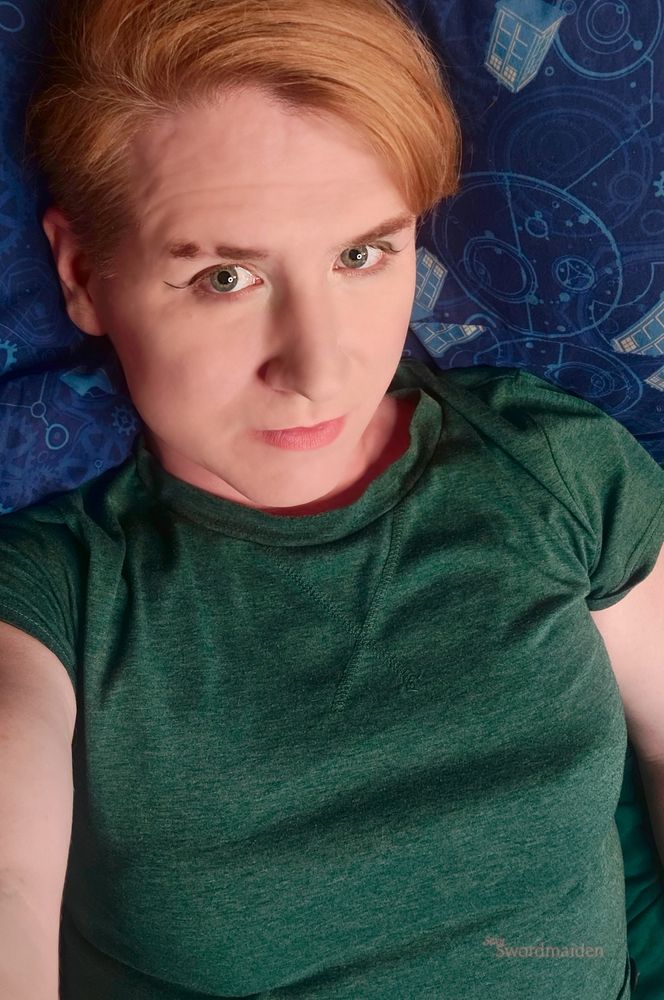 I wasn't done yet.A redheaded transfeminine person, Sarah Miranda, is wearing a tank top and lipstick