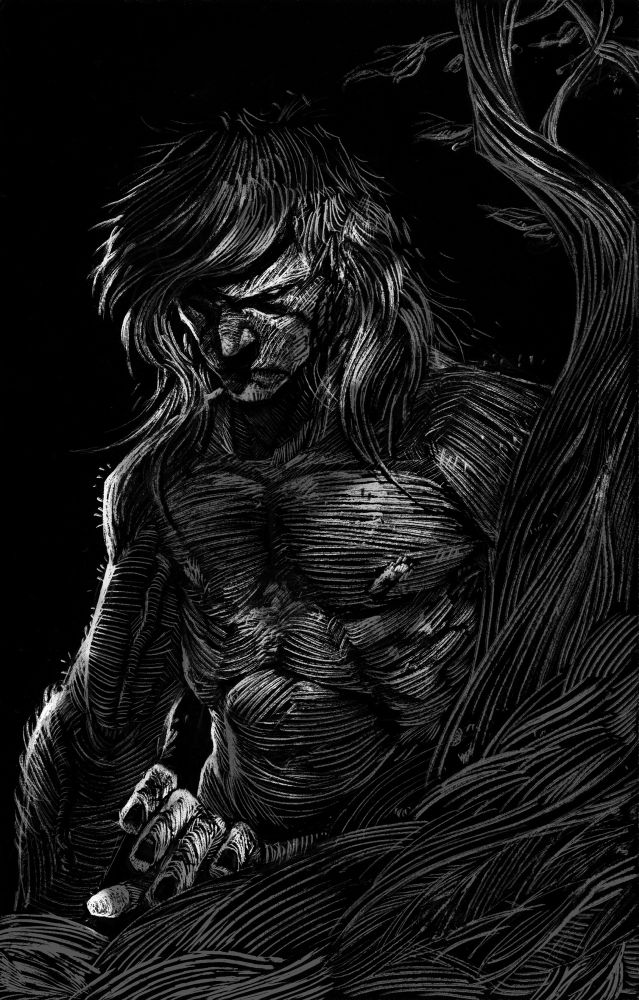 Frankenstein’s monster on scratchboard