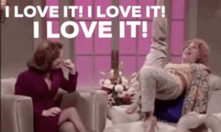 a woman sitting on a couch with a man laying on her lap with the words i love it i love it