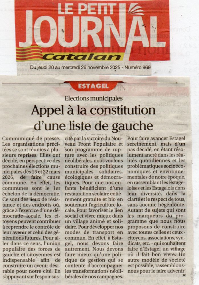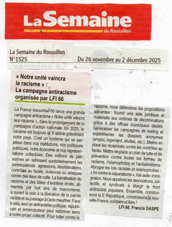 Soutien au groupe d'action d'action Estagel/Agly/ Fenouillèdes de La France Insoumise et son animateur Hugo Roquere.