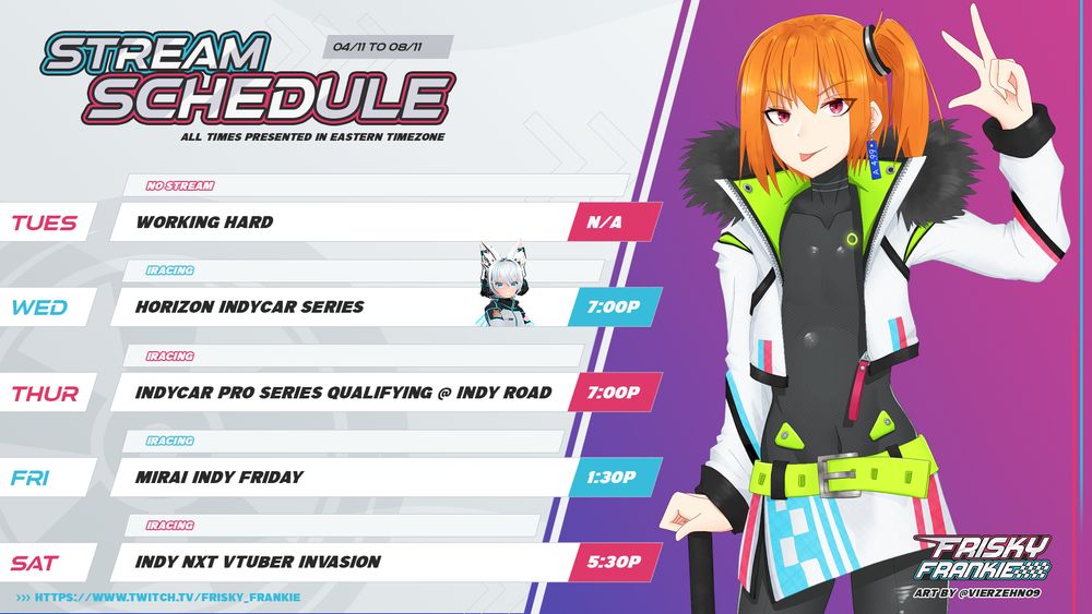 Another week of Indy racing on iRacing but we have a special collab on Tuesday with @lithiumfox.vtubers.racing, @katkisumiri.vtubers.racing and @owen.burger.moe!