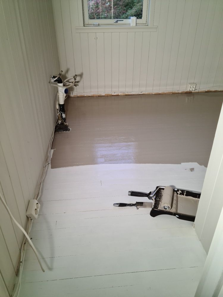 Første strøk med grunning tatt på gulvet. #hytta #renovering #kjedelig