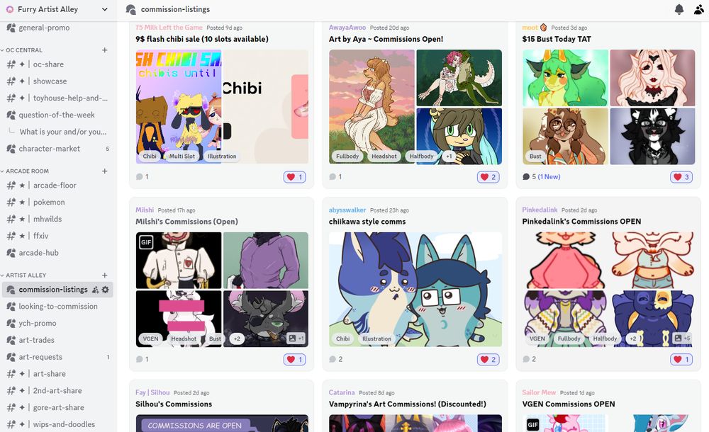 We have a channel for members to post commissions they're interested in getting and the artists in the server advertise their comms in those posts!