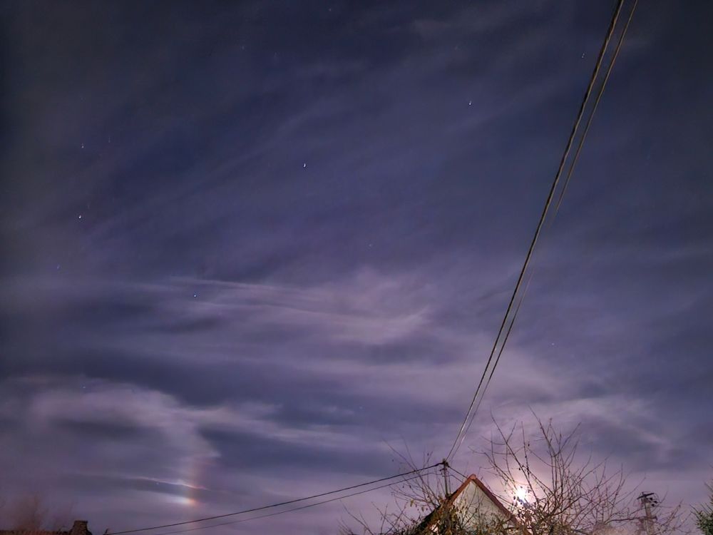 Kann mit einer sagen was das regenbogenartige links ist? Rechts ist der Vollmond. Reflektieren die Wolken? Man sieht es auch mit bloßem Auge ein wenig. Aber auf dem Foto ist es deutlicher. Können Sie mir helfen Herr @realkachelmann.bsky.social ?