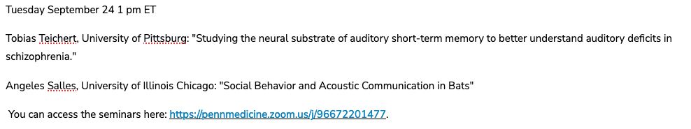 EARS seminars resume today with Tobias Teichert and Angeles Salles at 1 pm ET pennmedicine.zoom.us/j/96672201477