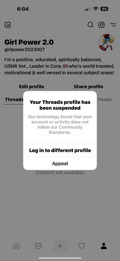 What a joke…as I post exactly the same comments on Threads that I do on Blue Sky…so, I appealed my suspension on Threads & we’ll see what happens🤔🤔🤔🙄🙄🙄if they suspend me permanently, then I’ll just say good riddens to both Instagram/Threads & Facebook!