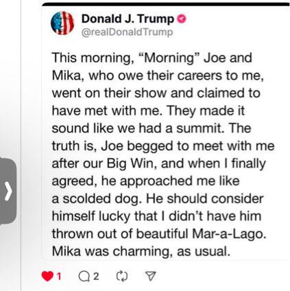 I’m soooooo glad DJT showed his true colors quickly! Yeeees this is exactly what Mika/Joe get for their 💋💍visit🤫😁😁😁😁😁😁thanks @cmocre on Threads for sharing DJT’s post w/me!