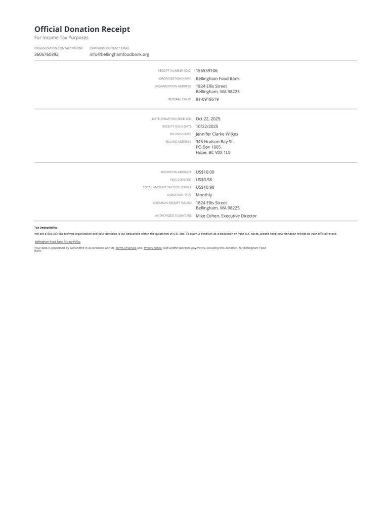 Here is the receipt for my fonation to the Bellingham WA food bank. Thanks for doing this.