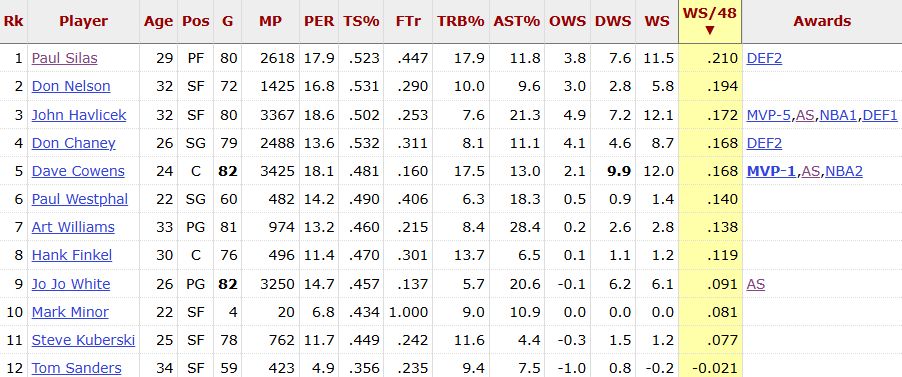 During the 1972-73 season when the Celtics went 68-14, Silas had a higher WS/48 than Cowens (MVP, All-NBA, All-Star), Havlicek (All-NBA & All-Star), and Jo Jo White (All Star), plus Nelson, Westphal, and Chaney.