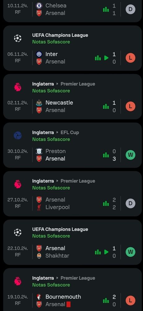 Já o Arsenal, no seu período de maior oscilação na temporada (19/10 a 10/11 - 7 jogos), perdeu 10 pontos na Premier League: 2 derrotas e 2 empates nesse recorte.