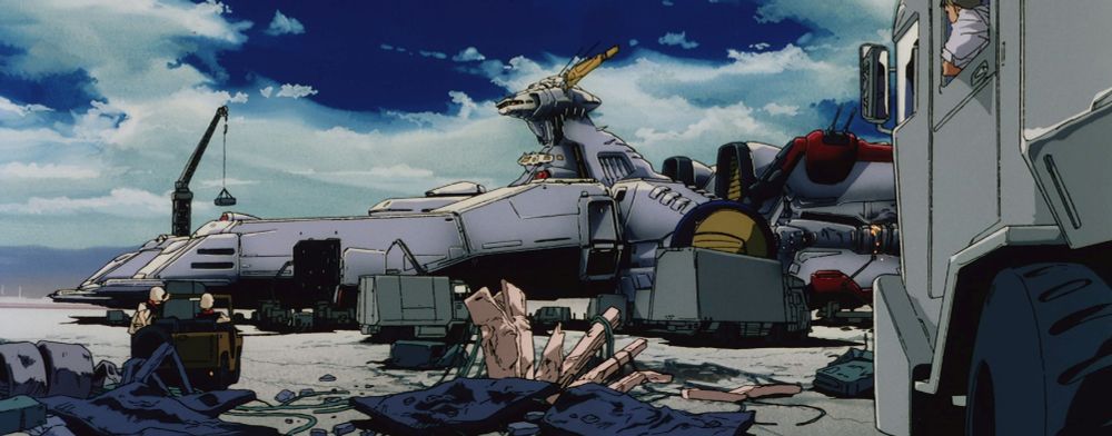 On the other hand 0083 episode 3 has lots of pans, especially these long horizontal shots showing the aftermath of Gato's raid on the Federation base: