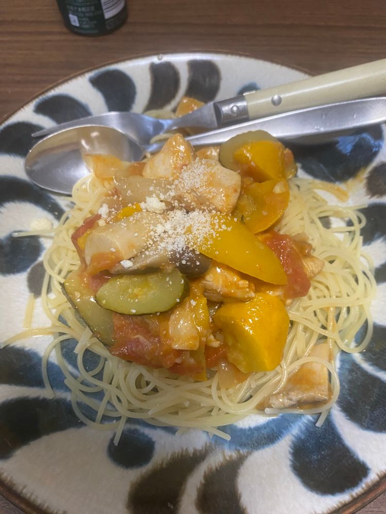 リクエストでラタトゥイユ作ってくれとの事で作ったら茄子を🍆入れ忘れ、あちゃ〜てな具合でラタトゥイユ冷製パスタ #青空ごはん部