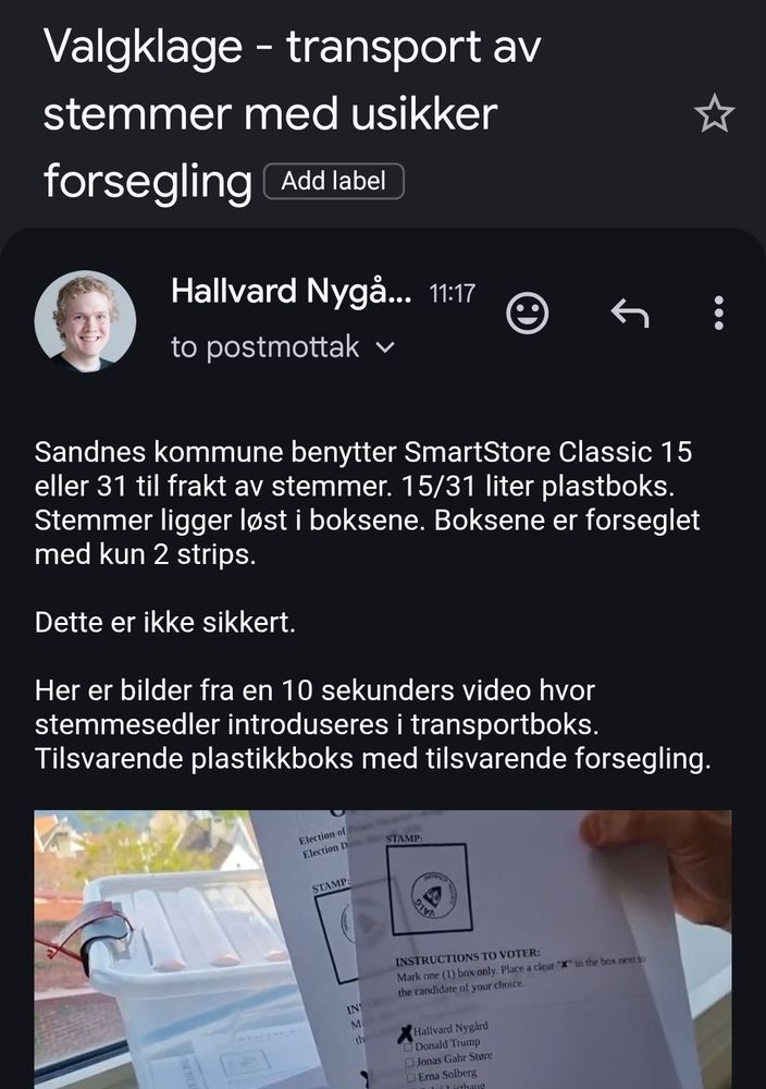 Bortvist fra alle opptellinger i distriktet med begrunnelse at det er ulovlig å ta bilde av valgfunksjonærer (kom.adv sin påstand).
