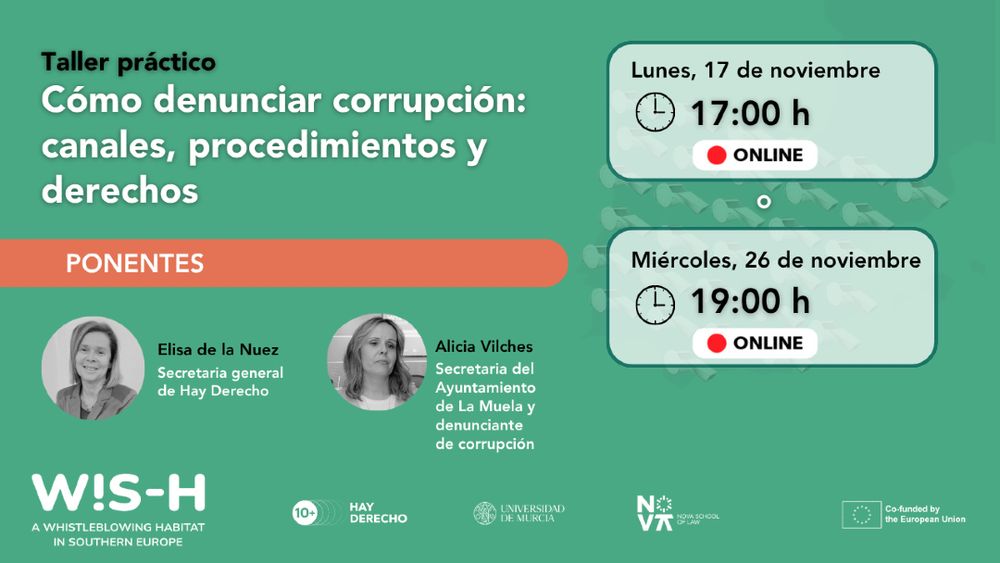 Organizamos un taller práctico online sobre cómo informar de irregularidades y casos de corrupción de manera segura, informada y conforme a la ley 🗣️.
