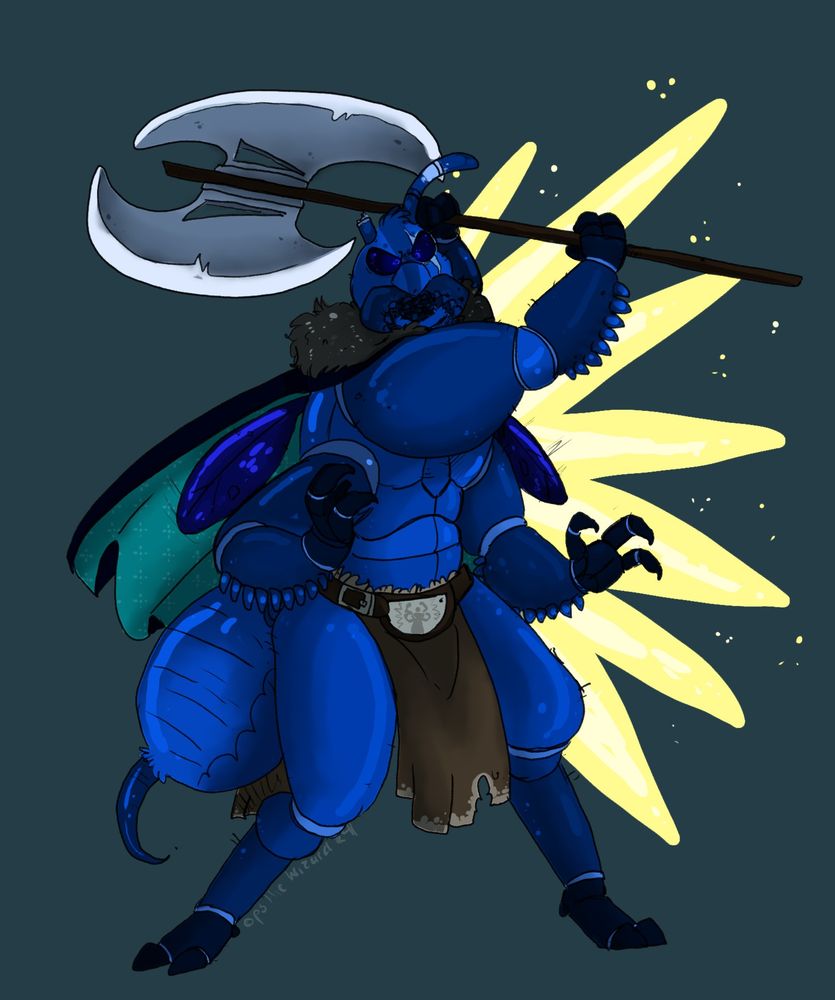 This is my current PC, Rukka. a Thri-kreen Barbarian who is "technically" a mercenary, but takes all the jobs that no one else wants because he's Lawful good and doesn't want to steal/murder.