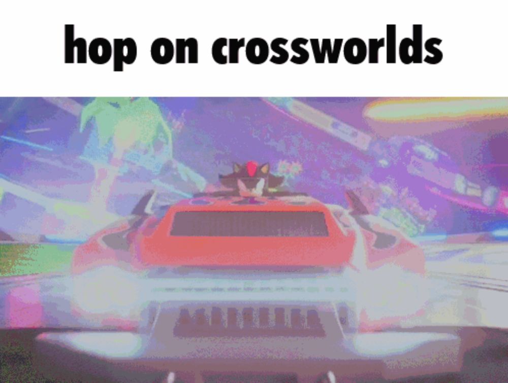 ALT: a cartoon of a car with the words hop on crossworlds above it