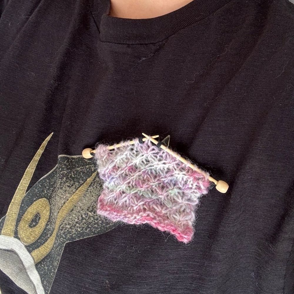 スタートは「共糸で同じ編み方したミニ編み地のブローチ作れたら、きっとオシャンで楽しいよね」でした。