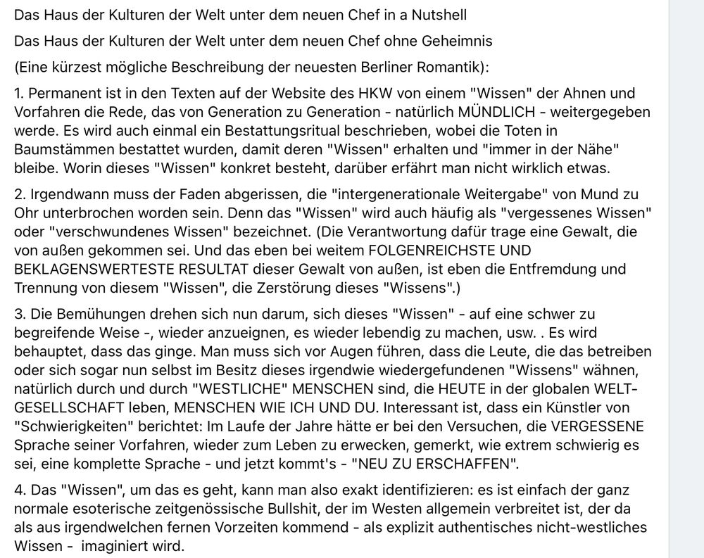 Eine Differenz zwischen DADA und HKW: DADA wollte einen fragwürdig gewordenen SINN, der im Verdacht stand, die bürgerliche Herrschaft zu stützen, zerstören, während der esoterische HKW-Mummenschanz den BIG SINN ja gerade autoritär stiften und etablieren will.
