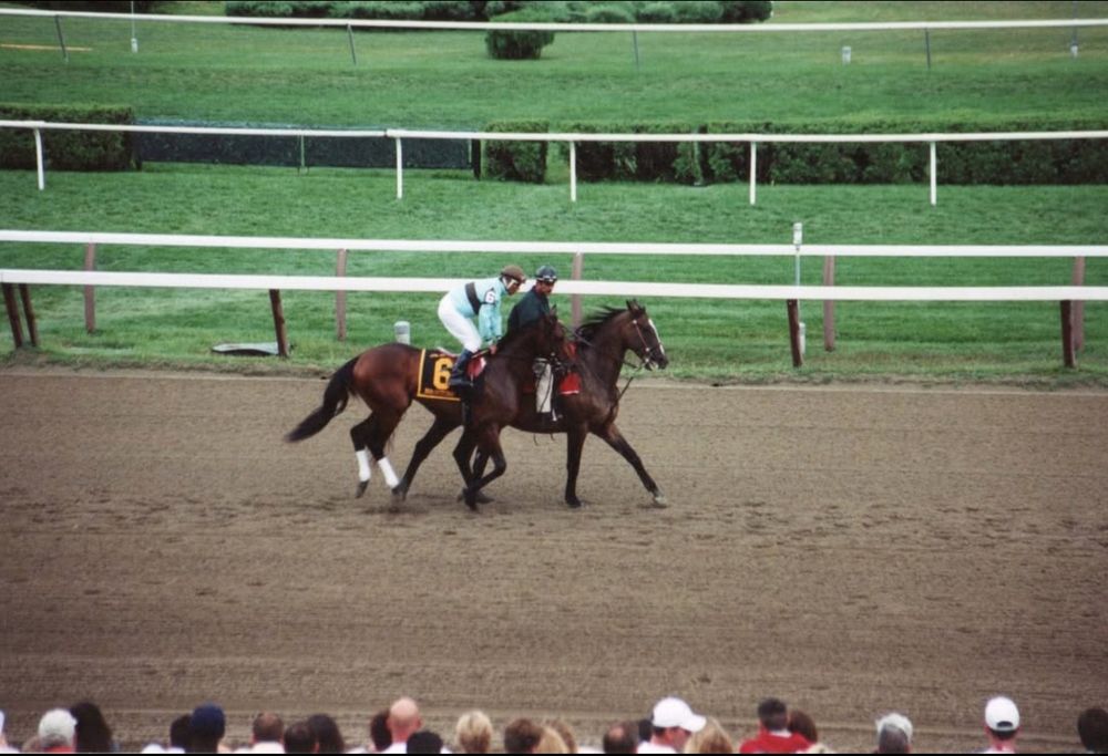 Hitting the gate at start, he rallied five wide & finished 4th. Next year he foiled Smarty Jones's Triple Crown bid. Also won the Travers in a thunderstorm. We ran out in the rain, cheering beside the winner's circle where Marylou Whitney celebrated.