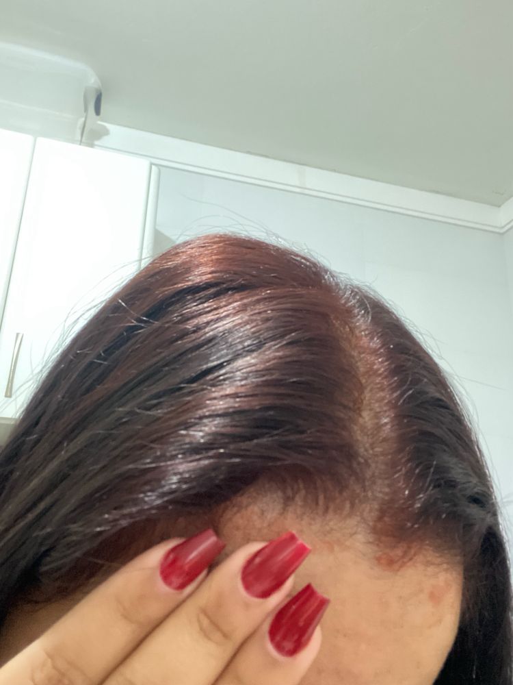 meu cabelo tá assim, pegou mais na raiz mesmo, pelo menos a unha tá combinando