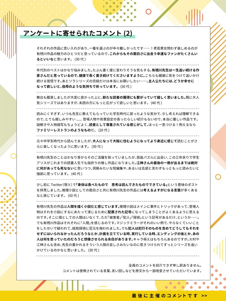 【有栖川有栖作品・非公式アンケート2024結果発表】まずは「あなたがミステリとして評価する火村英生&作家アリスシリーズ・江神二郎&学生アリスシリーズ」編1位の発表です。(1/9)