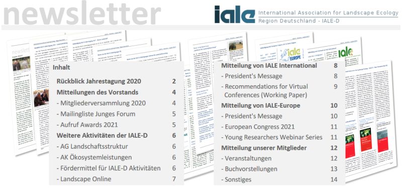 u.a.: Rückblick virtuelle IALE-D Tagung 2020, Europäischer Kongress #Landschaftsökologie 2021, Junges Forum LÖK, Ausschreibung IALE-D Awards und Förderungen, IALE International, IALE-Europe... Weitersagen!