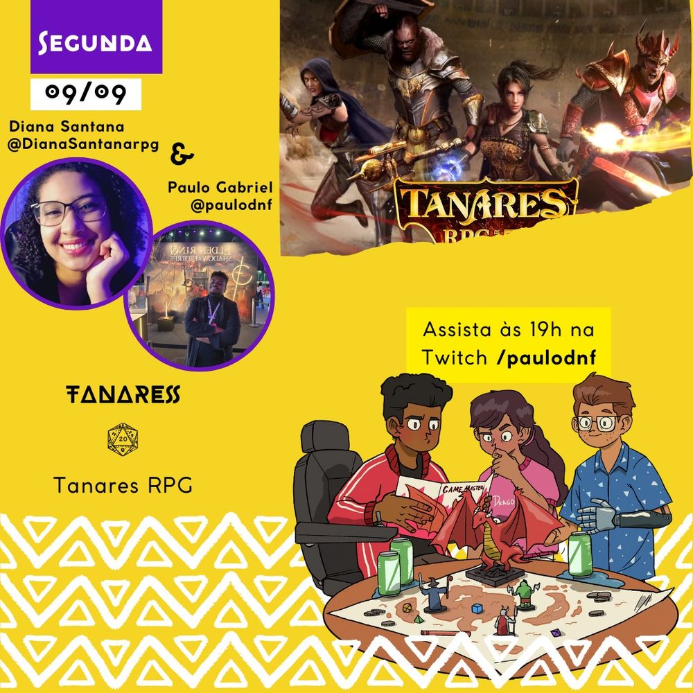 @paulodnf.bsky.social e @dianasantanarpg.bsky.social jogam #Tanares às 19h na Twitch /paulodnf!