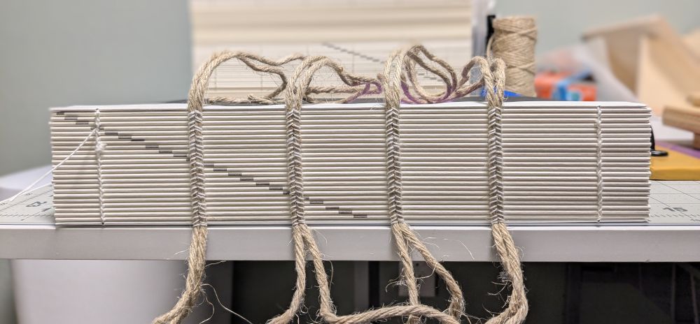 Next to affix the ribbon bookmark, the endbands (premade this time), and the mull to the spine. Then I'll be able to start on the Bradel case!