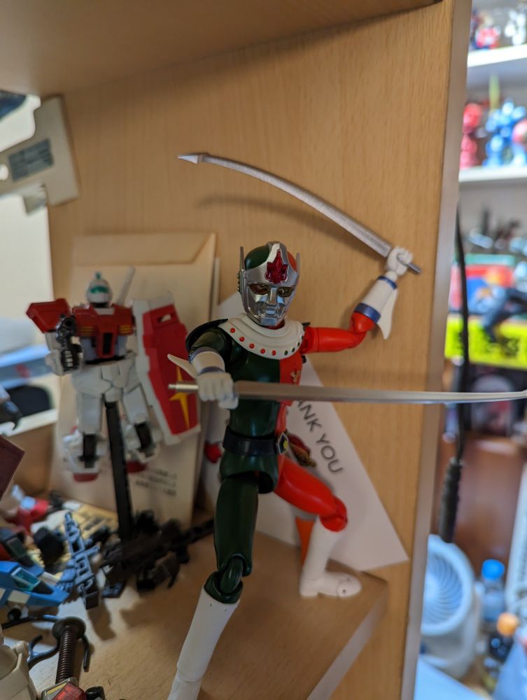 HAF(ヒーローアクションフィギュア) 恐竜大戦争アイゼンボーグより、アイゼンボー。HAFシリーズは基本的に格安の特撮ヒーロー系フィギュアシリーズ(たまにアニメも扱う。テッカマンブレードとかSSSSグリッドマンもラインアップにあった)。稼働とかはそこまで凝った作りではないけど、1万円未満というお手軽価格と割とマニア向けのラインアップということで在庫確認出来次第、ちまちま購入してる。アイゼンボーはとにかく昔から1、2を争うくらい好きな特撮ヒーローでこのちょっと情けないテイストの表情が最高。しかも急な路線変更で巨大ヒーロー出す予定なかったのに急遽だすことになったため名前がなんか変。だがそれがいいw