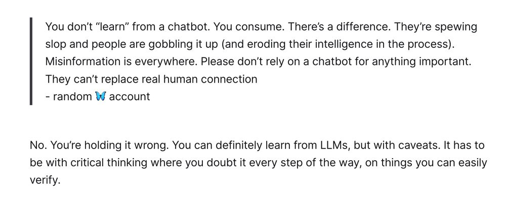 "You don’t `learn` from a chatbot. You consume...They’re spewing slop and people are gobbling it up." - random 🦋 account