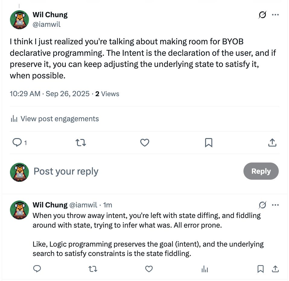 I think this was my ah-ha moment. UI = f(state) doesn't allow for temporarily illicit states. Without intents as first-class data, you resort to state fiddling, diffing, and inference of previous state.