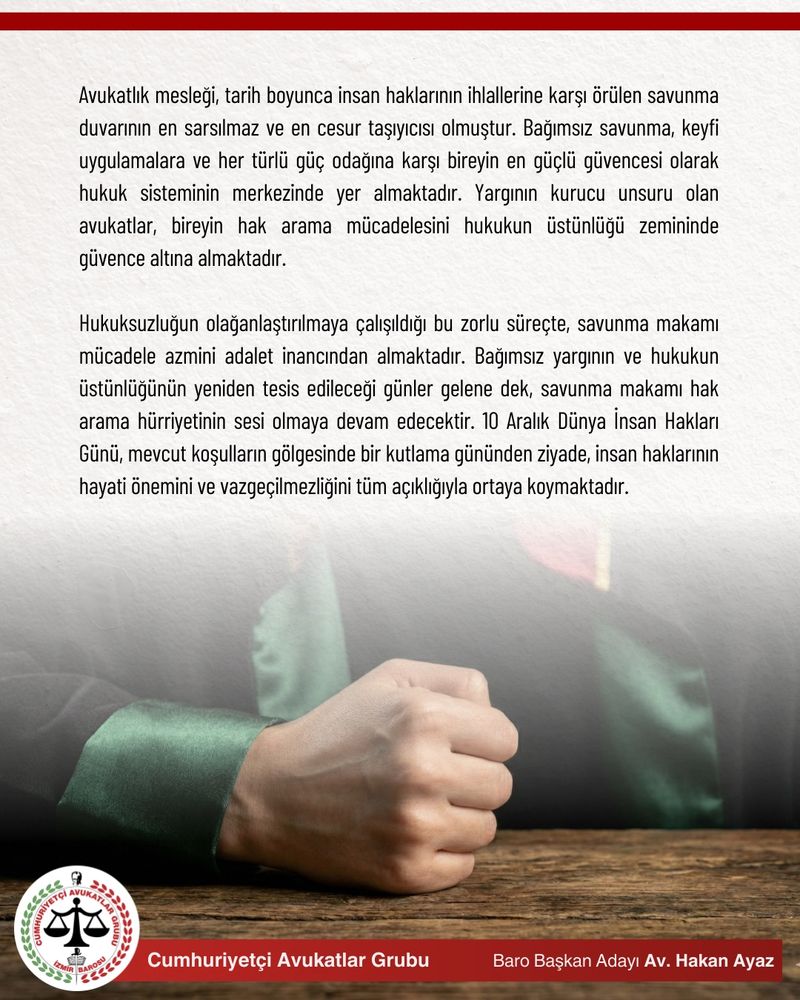 Cumhuriyetimizin 102. yılında, Atatürk’ün bize bıraktığı emaneti omuzlayarak; hukukun üstünlüğüne, laikliğe, yargı bağımsızlığına ve savunma makamının onuruna kararlılıkla sahip çıkıyoruz.