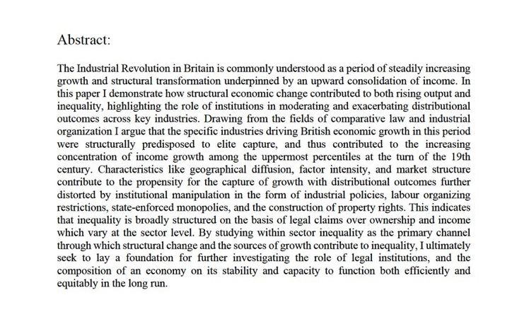 In simple terms I argue that elevated income inequality during the Industrial Revolution was in part a result of the shift in sectoral composition of output, with the growing industrial sector being structurally predisposed to elite capture relative to other sectors. 2/11