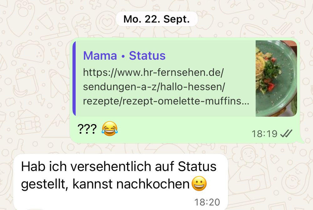 keine ahnung, warum, aber ich find‘s so witzig, dass meine mutter ab und an versehentlich irgendwelche rezept-links in ihren whatsapp-status haut. heute ist es endlich wieder passiert.