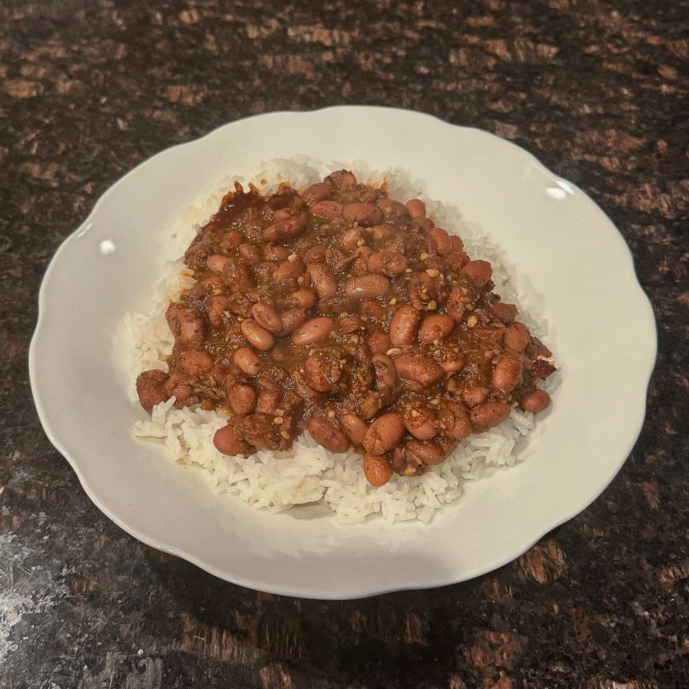 Ham and egg fried rice with gochujang and sweet red peppers.