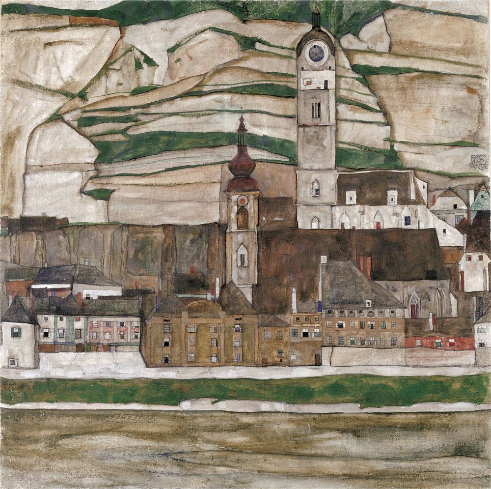 Deborah Solomon, in the Times, describes "a long brown box" looking like a coffin, "buried in the soft earth" under the bridge in this Egon Schiele painting. I'm pretty sure it's just a reflection in the water of the underside of the bridge. But see whatever you want, I guess..